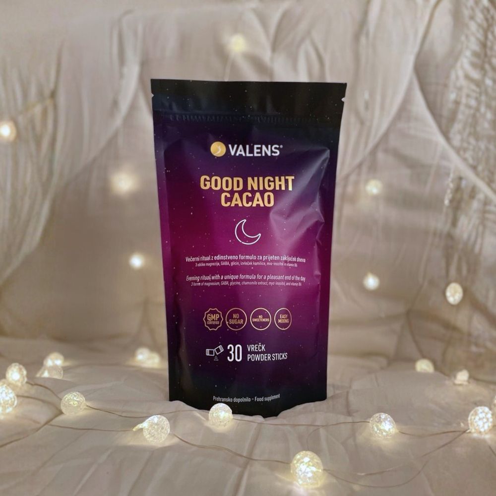 Valens Good Night Cacao is a modern evening supplement designed for anyone who wants to end the day with comfort, calm, and a sense of ease. This innovative formula transforms into a warm or chilled cocoa drink that gently supports both body and mind after a demanding day. Crafted with a thoughtful blend of premium ingredients, it offers a complete, well-rounded evening experience: