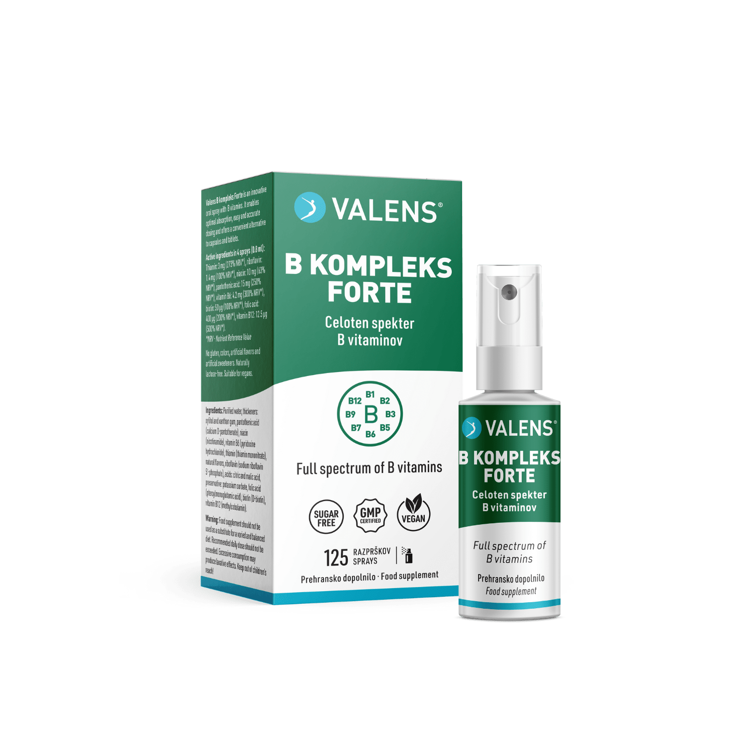 Valens B kompleks Forte is an innovative oral spray supplement, offering a high concentration of full spectrum of essential B vitamins. Oral spray form facilitates faster and better absorption through the membranes of the oral cavity. This form is particularly convenient for those with digestive absorption issues, presenting a tasty alternative to capsules and tablets. Valens B kompleks Forte is sugar-free – it contains only natural flavors and xylitol, which is naturally occurring in certain fruits.